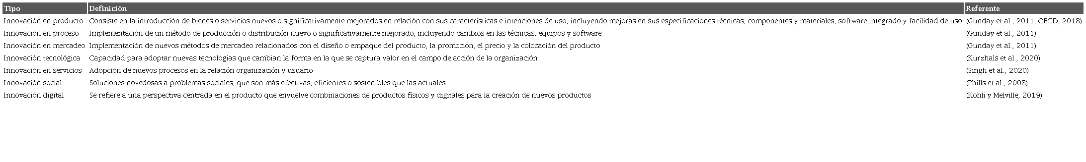 Desde la organización, la innovación se percibe como una capacidad para producir nuevas y mejores ideas que a través de procesos organizacionales se implementan de manera sistemática para la creación de nueva riqueza (Adam et al., 2020). En ese sentido, las mejoras estructurales que implican la innovación son beneficiosas para la organización, dado que resultan en un mayor desempeño de innovación y se mejora la eficiencia en la realización de procesos y la efectividad y calidad (Drucker, 1995). La innovación se concibe como un inductor de cambios en la estrategia, la estructura, los procesos y los sistemas organizacionales con el propósito de mejorar la coordinación en el trabajo en equipo, el flujo de información y la adquisición de conocimiento (Adam et al., 2020). En la literatura se reconocen diferentes tipos de innovación que se resumen en la tabla 1.