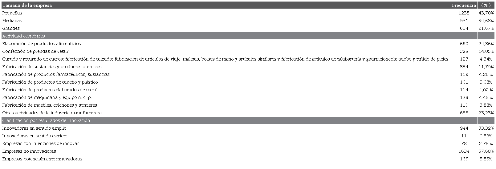 Los intereses particulares de este estudio se centran en las empresas que obtuvieron resultados a partir de las innovaciones que introdujeron al mercado en el periodo considerado por la EDIT. En ese sentido, se extrajo de la base de datos de la EDIT una submuestra de empresas que para el periodo en consideración habían hecho uso de cualquiera de las modalidades de registro y protección de la propiedad intelectual en el país, dado que para países emergentes como Colombia estos registros sugieren resultados positivos de las actividades de innovación de las empresas, obteniendo una muestra de 2833 empresas. Las características de la muestra se presentan en la tabla 2.