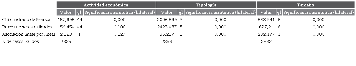 Mediante el método de análisis de los componentes principales, se determinó mantener los componentes clasificación sectorial, tipología y tamaño, que explican el 44,226, 32,989 y 22,785 % de la varianza, respectivamente.