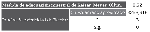 De acuerdo con los resultados, se establece que el tamaño de la muestra es adecuado, dado que el resultado de la prueba KMO (0,520) se encuentra levemente por encima del valor mínimo aceptable de 0,5 (Kaiser, 1974). Respecto a la prueba de esfericidad de Barlett, se obtuvo una significancia asintó-tica <0,05 (0,000), lo que sugiere que los datos son adecuados para llevar a cabo el análisis factorial, como se observa en la tabla 4.