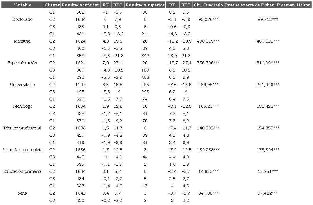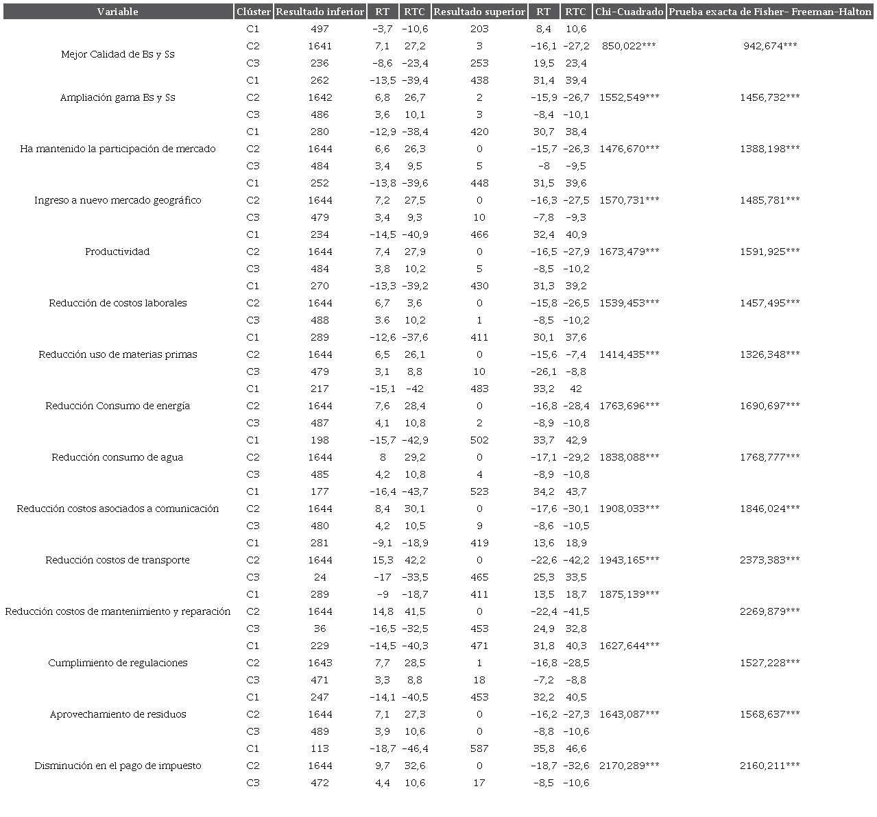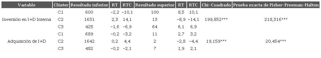 Con el fin de resumir los resultados que alcanzan las empresas de los diferentes clústeres en variables específicas de innovación, la estructura interna del equipo dedicado a actividades de CTI y el enfoque mediante el que desarrollan I+D en la organización, se acudió a las tablas de contingencia, una metodología ampliamente aceptada para sintetizar el comportamiento conjunto de variables categóricas. En ese sentido, se verificó que la significancia de las pruebas chi-cuadrado y la prueba exacta de Fisher-Freeman-Halton fueran inferiores a 0,05 y que los residuos tipificados corregidos (RTC) fueran superiores a 1,96 o inferiores a -1,96 para determinar la asociación entre las variables (Hair Jr. et al., 2010).