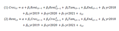 Una segunda parte del análisis consistió en cuantificar la relación entre crecimiento y rentabilidad, y el impacto de la pandemia sobre cada una de estas variables. Para ello se utilizó la metodología de datos panel, tomando el periodo 2017-2021. También se utilizaron ecuaciones no lineales de la relación crecimiento-rentabilidad, tal como se evidencia en las ecuaciones (1) y (2), respectivamente.