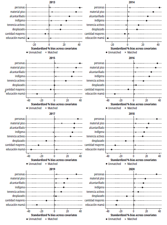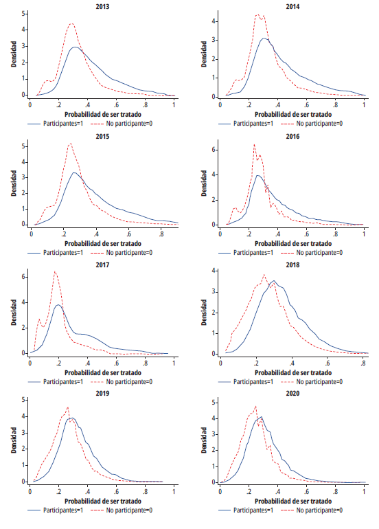 En segundo lugar, se lleva a cabo el emparejamiento para cada año utilizando la metodología PSM. Este enfoque implica comparar solo los tratados y no tratados dentro de un soporte común, es decir, unidades con probabilidades similares de participación en el tratamiento. Esta probabilidad se estima mediante variables que determinan la participación en Familias en Acción (tabla 1). Aquellas unidades que quedan fuera del soporte común se excluyen del emparejamiento.