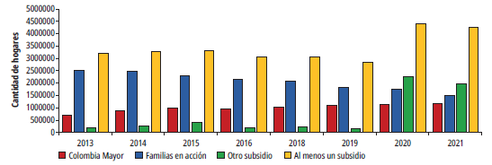 En cuanto al programa Familias en Acción, este ha experimentado una disminución progresiva desde el año 2015, mientras que Colombia Mayor ha mostrado un aumento constante entre 2013 y 2021, aunque la población beneficiaria de este programa es apenas una pequeña parte de los adultos mayores que no poseen una pensión. En términos generales, la tasa de crecimiento anual de Colombia Mayor entre 2013 y 2021 fue del 6,5 %. En contraste, Familias en Acción experimentó un decrecimiento del 6,4 %, y la cantidad de hogares que recibieron al menos una transferencia monetaria aumentó en 3,6 % durante ese período.