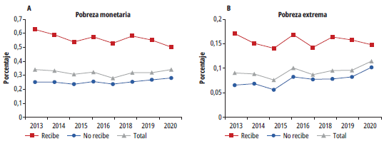 La figura 2 demuestra que la pobreza monetaria ha tendido a disminuir de manera más rápida en los hogares que reciben alguna transferencia en comparación con aquellos que no, aunque aún se mantiene en niveles considerablemente más altos. Además, también permite observar una convergencia entre la pobreza monetaria y la pobreza extrema entre los participantes y no participantes de los PTM. Sin embargo, esta convergencia no se debe únicamente a la reducción de la pobreza en los beneficiarios, sino también al aumento de la pobreza en los no beneficiarios. Esto coincide con los modestos resultados en la disminución de la pobreza a nivel agregado, ya que mientras la población beneficiaria disminuye el indicador, la población no beneficiaria lo aumenta.