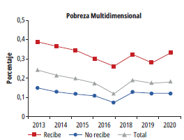 De igual forma, en la figura 2 también se observa un aumento de la pobreza monetaria para el 2020, tanto a nivel general como entre los no beneficiarios de los programas, mientras que entre los beneficiarios se registró una disminución. Este fenómeno también se evidenció en el caso de la pobreza extrema. Estos hallazgos revelan una situación particular, ya que las transferencias monetarias desempeñaron un papel crucial en la contención del aumento de la pobreza monetaria, lo cual podría considerarse un aspecto positivo. Empero, es importante matizar esta situación, ya que también indica la vulnerabilidad de la mayoría de los hogares, lo que sugiere que la política social no ha logrado proporcionar a las personas una forma efectiva de superar la pobreza a través de la generación autónoma de ingresos.