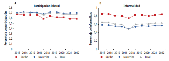 Finalmente, en cuanto al mercado laboral, según los datos de la Ecv, se puede apreciar en la figura 4 una disminución en la participación en el mercado laboral en el conjunto de la población. No obstante, esta disminución ha sido más pronunciada entre los beneficiarios de los PTM que entre aquellos que no reciben ningún programa. Además, se observa una tasa de informalidad más alta en los hogares que reciben alguna transferencia en comparación con los que no reciben ninguna. Esta tasa ha permanecido relativamente estable a lo largo de todo el período en ambos grupos. En otras palabras, la informalidad ha sido difícil de reducir tanto en los beneficiarios como en los no beneficiarios de los PTM . Dado que las variables del mercado laboral se han comportado de manera similar, es difícil sostener a simple vista si los PTM tienen un efecto directo sobre estas.