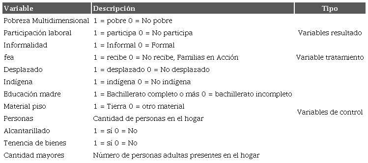 La variable de participación laboral se aplica a individuos mayores de 15 años que están empleados o en busca de empleo. En cuanto a la informalidad, se determina a través de las respuestas a preguntas relacionadas con la afiliación a la seguridad social y la cotización a un fondo de pensión, aplicándose únicamente a aquellos que se encuentran ocupados. Las variables de control o covariables comprenden características socioeconómicas seleccionadas debido a su relevancia como posibles factores determinantes para ser considerados beneficiarios de Familias en Acción; así como por su estabilidad a lo largo del tiempo, tales como la condición de desplazado, la etnia y la posesión de bienes, entre otras.