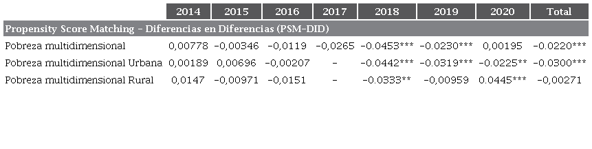 Los resultados se presentan para cada año desde 2014 hasta 2020, además del efecto total para el periodo. Las estimaciones se llevaron a cabo incluyendo controles. Sin embargo, debido a limitaciones de espacio y practicidad, se muestran únicamente el estimador PSM-DD correspondientes a cada año en este informe. En primer lugar, se exponen los resultados obtenidos en relación con la pobreza multidimensional. Antes de hacer el cálculo del PSM-DD se garantizó la calidad del emparejamiento, buscando reducir el sesgo al mínimo. Las gráficas de la prueba realizada por año se presentan en el Anexo 2.