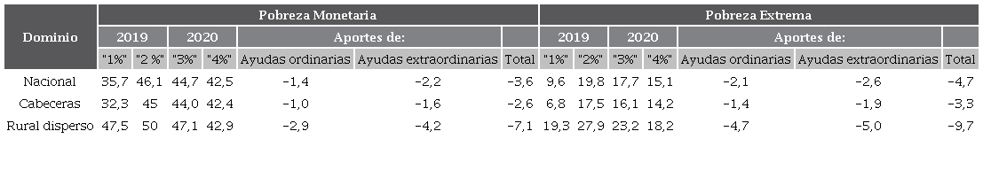 Sin embargo, cabe destacar que el efecto de la transferencia de dinero por la emergencia sanitaria en el corto plazo tuvo un efecto sobre los ingresos considerablemente mayor en el área rural que en la urbana en el caso de la pobreza monetaria. Según los cálculos realizados por el DANE para el año 2020, el conjunto de las ayudas sociales, considerando todas las transferencias monetarias ordinarias y extraordinarias1, el aumento de la pobreza monetaria debido a la pandemia de COVID-19 fue 3,6 pp menor de lo esperado a nivel nacional, 2,6 en la zona urbana y 7,1 en el área rural. En el caso de la pobreza extrema a nivel nacional, la disminución fue de 4,7 pp, con 3,3 % en la zona urbana y un 9,7 % en la rural, como se observa en la tabla 4.