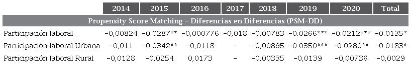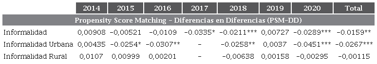 En cuanto a la informalidad, en la tabla 6 se observa que en el primer año y en el 2019 se obtiene un efecto positivo, aunque no significativo, mientras que en los demás años el efecto es negativo y significativo para el 2018 y 2020. Así mismo, en la totalidad del período se da un efecto negativo de 1,5 puntos porcentuales. Este efecto es significativo solo en el caso de la zona urbana, mientras que en el área rural en ningún año se da un efecto estadísticamente significativo.