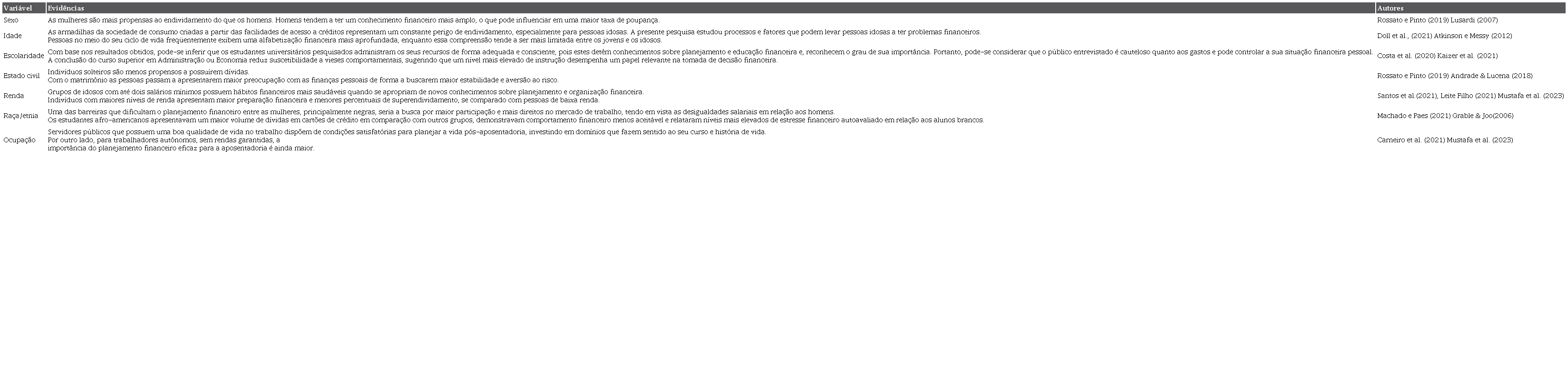 Entretanto, nem todos os indivíduos percebem e praticam o planejamento financeiro da mesma forma. A literatura apresenta evidências de differentes percepções segundo diferentes perfis socioeconômicos e demográficos, conforme apresentado na Tabela 1.