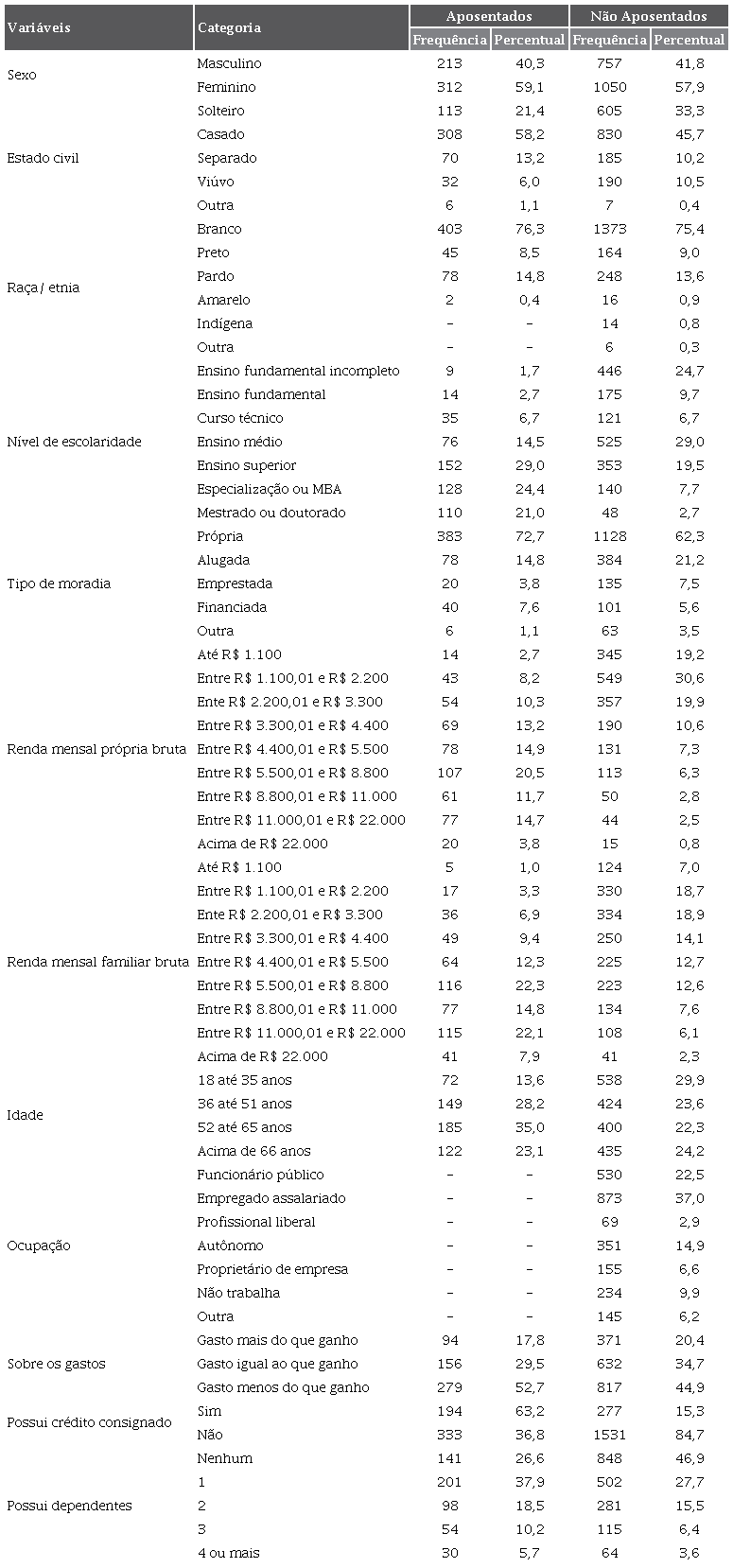 Os dados foram coletados entre outubro de 2021 e janeiro de 2022, distribuídos em 12 capitais e 20 cidades interioranas. A amostra total obtida foi de 2401 respondentes. A Tabela 2 apresenta o perfil dos entrevistados segundo a aposentadoria.