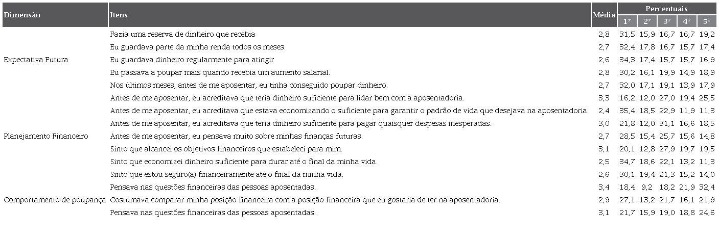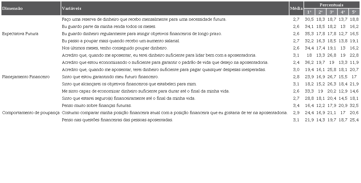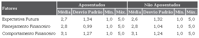 Considerando as Tabelas 3 e 4, na dimensão Expectativa Futura, a média ficou abaixo de 3 tanto para aposentados quanto para não aposentados. Dessa maneira, pode-se concluir que há uma dificuldade no planejamento financeiro dos indivíduos, gerando uma falta de clareza com relação a uma visão financeira para o futuro.
