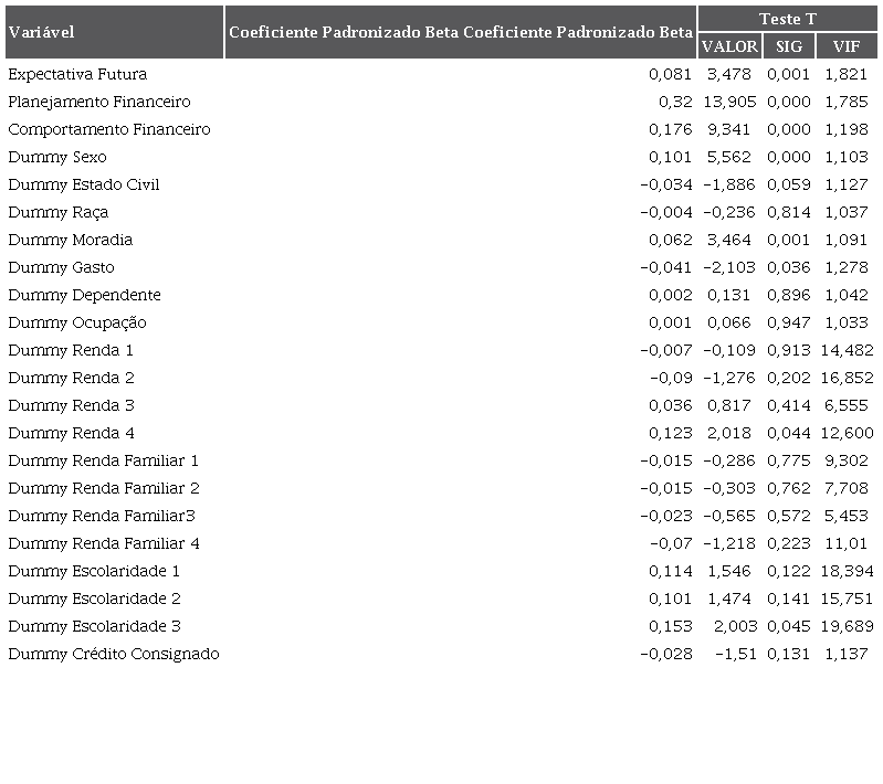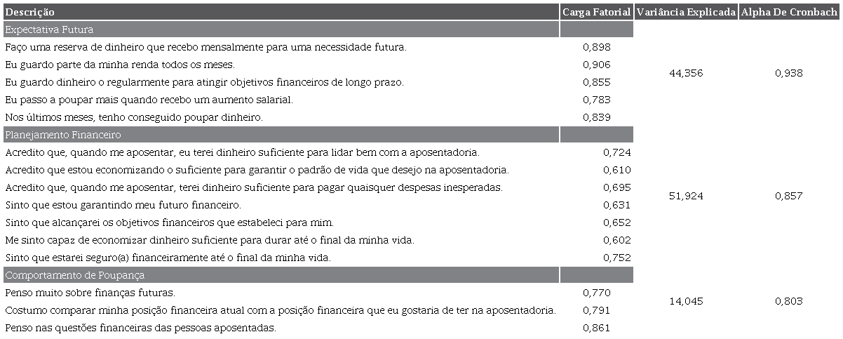 A estimação apresentou índices de fatora-bilidade aceitáveis para o estudo, uma vez que o teste KMO foi superior a 0,5 e o teste de Bartlett foi significativo. Por apresentarem comunalidade extraída menores que 0,5, foram retirados os itens "Acredito que, quando me aposentar, eu terei dinheiro suficiente para lidar bem com a aposentadoria", "Acredito que, quando me aposentar, terei uma casa própria quitada" e "Antes de comprar algo, eu considero cuidadosamente se posso pagar".