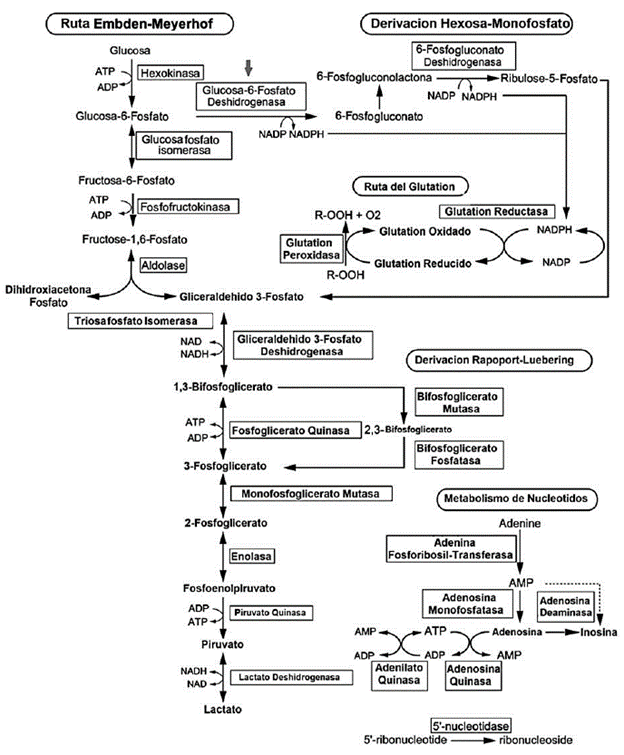 Esta subordinación metabólica que caracteriza a los glóbulos rojos, conlleva una seria implicación relacionada a la dependencia de la correcta acción catalítica de aproximadamente 20 enzimas (Figura 1), moléculas que no son renovables dentro de la misma célula dada la ausencia de núcleo y cuya deficiencia son la causa de un grupo de trastornos hemolíticos agrupados como enzimopatías eritrocitarias, un grupo de alteraciones de amplia expresión fenotípica que incluyen grados diversos de anemia hemolítica no esferocítica e hiperbili-rrubinemia, entre otras manifestaciones 2,4.