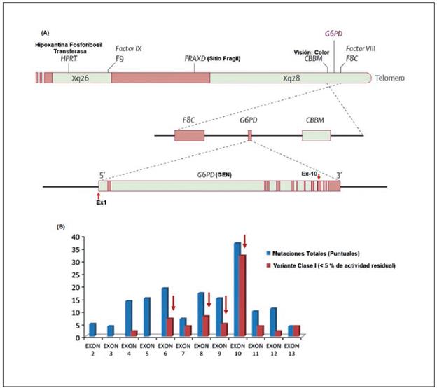 El gen de la G6PD que fue secuenciado en el año de 1986, se encuentra localizado en la región telomérica del brazo largo del Cromosoma X (Xq28), consiste de 12 intrones y 13 exones que codifican para una secuencia de 515 aminoácidos (Ver Figura 2A). La literatura mundial ha documentado 186 mutaciones hasta la fecha, donde el 85,4 % corresponden a cambios puntuales que se distribuyen en todos los exones que codifican la enzima, con una mayor frecuencia a nivel del exón 10 (Ver Figura 2B) 9,10.