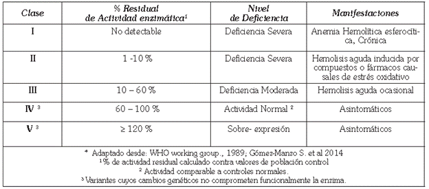 Con respecto al grado de compromiso enzimático, como es frecuente en los errores innatos del metabolismo, a medida que se han estudiado las poblaciones afectadas por esta deficiencia, se han documentado grandes diferencias en el porcentaje residual de la actividad enzimática y la gravedad de las manifestaciones clínicas, ejemplifica este aspecto el paralelo entre la severidad encontrada por ejemplo en los asentamientos humanos de origen mediterráneo y la expresión más benigna de la enfermedad en individuos afroamericanos. Estos hallazgos han establecí-do una clasificación dependiente de la actividad enzimática estandarizada por la organización mundial de la salud que se relaciona a la severidad clínica y el comportamiento enzimático de las enzimas mutadas, que oscila desde las formas clásicas con valores de actividad enzimática < 5 % de actividad residual hasta individuos con expresiones limítrofes o comparables a valores de individuos control (Ver tabla 1) 12,16.