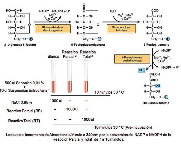 El medio de reacción involucra un Buffer Tris (Hidroximetilaminometano) 150 mM pH:7.5 a partir del cual se prepararon dos componentes de reacción: Reactivo Total (RT): 50 ml de Buffer que contiene Cloruro de Magnesio 14,95 mM, NADP 0,3 mM, Glucosa-6-Fosfato 1,06 mM y Acido Fosfogluconico 0,82 mM y Reactivo Parcial (RP): Contiene los mismos elementos citados anteriormente excepto Glucosa-6-Fosfato. La estabilidad de los materiales es de 3 meses en congelación (-20 °C). Observación: El Reactivo Total (RT) permite la valoración de la actividad simultánea de la G6PD y la fosfogluconato deshidrogenasa (FD) y el Reactivo Parcial (RP) valora solamente la actividad de la FD, desarrollando in vitro la misma reacción in vivo (Ver figura 5).