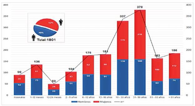 Durante el periodo de estudio fueron analizados 1801 controles en un rango de edad de: 1 semana de vida (Periodo Neonatal) hasta 91 años. Los grupos etarios para los análisis descriptivos fueron divididos en Neonatos, Lactantes menores (1 a 12 meses), Población pediátrica (1- 14 años) y Mayores a 15 años, siguiendo el comportamiento de los valores hemáticos que muestran los mayores cambios en estos grupos poblacionales 31, sin embargo, la figura 6 muestra una distribución más detallada de la población control estudiada.