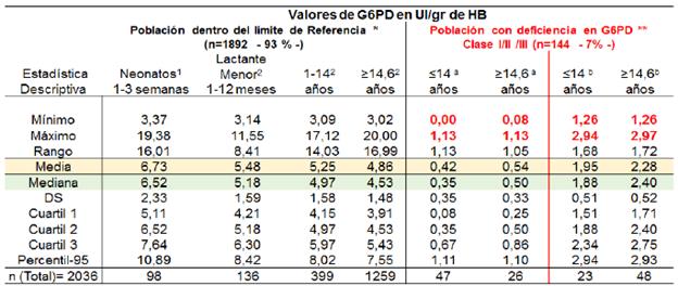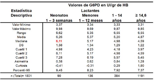 Los análisis enzimáticos mostraron un rango de actividad normal para G6PD que incluye a todos los grupos estudiados de 3,31 a 9,98 UI/gramo de HB. La mediana como valor de tendencia central más firme, permitió ver una diferencia significativa en la actividad enzimática entre el grupo Neonatal y la población > 15 años (Ver Tabla 2).