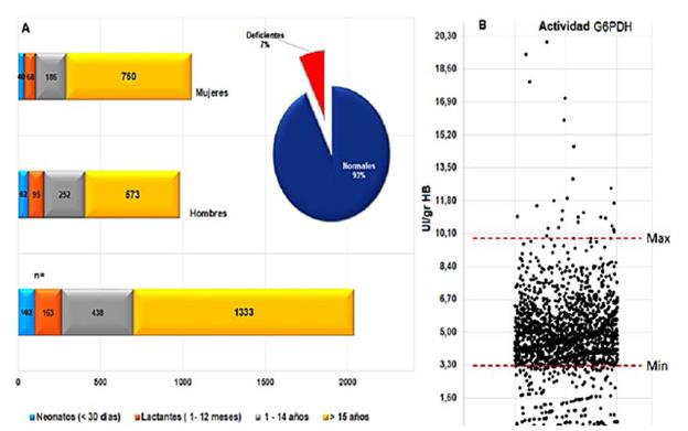 A deficiência de glucose-6-fosfato desidrogenase é uma desordem hereditária do metabolismo ligado ao X, como a doença metabólica da maior freqüência do mundo com mais de 400 milhões de indivíduos afetados, é a causa mais comum de anemia hemolítica não autoimune de origem metabólica. A prevalência calculada para a Colômbia de acordo com a organização mundial de saúde é entre 3 e 7%, mas os relatórios de estudos populacionais são escassos, criando a necessidade de incluir esta deficiência em um programa de triagem neonatal, perto de 11% a população é afro-descendente que sem a miscigenação, pode oferecer uma maior frequência de deficiência em certas regiões do país. O presente estudo fornece uma visão geral da prevalência de doença enzimática de eritrócitos na população com anemia hemolítica crônica ou episódica de natureza não imune de diferentes partes do território nacional. Compreende a avaliação de 3837 amostras durante o período de 1998 a 2016, um total de 1801 controles e 2036 indivíduos (982 homens / 1054 mulheres, faixa etária: 1 semana a 91 anos) com achados sugestivos desta condição metabólica. Os resultados encontrados, oferecem uma prevalência de 7% da deficiência com graus variáveis de atividade residual. O intervalo geral dos grupos de controle variou de 3,31 a 9,98 Ul / g de HB, contrastando com o grupo de afetados (n = 144) que ofereceu um valor de 0,0-297, 67% = 96) corresponde a machos afetados. Esses achados destacam a importância de incluir esta doença enzimática de eritrócitos em um programa de triagem neonatal.