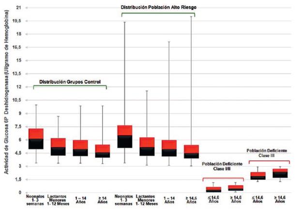 Este último aspecto, resalta finalmente la importancia del presente documento, dado que muestra una panorámica del tamizaje de alto riesgo para la deficiencia de G6PD durante 22 años en Colombia, utilizando una metodología espectrofotométrica de referencia y reportando el comportamiento enzimático de la población control e individuos con deficiencia parcial ó total de la enzima.