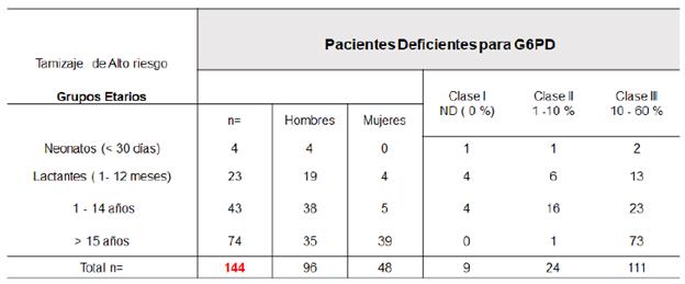 El presente estudio reúne una experiencia de tamizaje de alto riego, en la cual los resultados pueden reflejar un valor medio de la prevalecía nacional relacionada a la deficiencia de G6PD, cuya principal limitación ha sido la remisión de muestras liquidas que requieren cadenas frio en su transporte y que restringe el acceso de poblaciones de riesgo alejadas de las grandes ciudades, a este tipo de pruebas especializadas.
