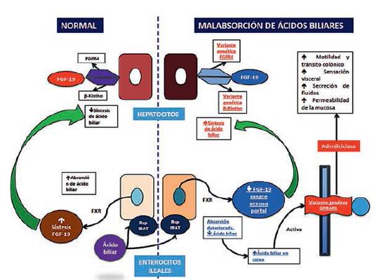 Los AB tienen la capacidad de solubilizar los ácidos grasos y monoglicéridos (producto de los triglicéridos) permitiendo su absorción 10. Los AB primarios, el ácido cólico y el ácido quenodesoxicólico son sintetizados en el hígado a partir del colesterol, se conjugan con glicina y taurina que aumentan su hidrosolubilidad y su secreción biliar 11. Los AB secundarios, como el ácido desoxicóli-co y el ácido litocólico, son generados a partir de los AB primarios por modificaciones realizadas por las bacterias, esto aumenta su absorción pasiva a nivel colon 12-14. La circulación enterohepática de AB fue descrita hace más de 40 años 15,16. El 95% de los AB primarios se reabsorben a nivel del íleon distal por el transportador apical activo dependiente de sodio de AB (ASBT) y regresan al hígado a través de la circulación portal 16,17. El 5% restante se elimina por las heces y se restituye por la síntesis hepática de novo, la cual es de aproximadamente 500 mg por día 18. La enzima colesterol 7 a-hidroxilasa (CYP7A1), integrante del citocromo P450, es la encargada de convertir el colesterol en 7 a-hidroxi-colesterol y es la principal reguladora del primer paso de la síntesis de AB. El receptor del hígado X y el receptor farnesoide X (FXR) están relacionados con la activación e inhibición de la CYP7A1, respectivamente 19. En los enterocitos del íleon, la unión de los AB con el FXR lleva a inducción transcripcional del factor de crecimiento del fibroblasto 19 (FGF19); la unión del FGF19 al receptor de membrana del hepatocito FGF tipo 4 (FGFR4) y su correceptor Klothob, activa vas intracelulares que disminuyen la expresión de CYP7A1 11,20, esto es un ejemplo claro de retroalimentación negativa hígado-íleon. Se ha encontrado en distintos estudios, que explican el posible mecanismo de mala-absorción de AB, niveles bajos de FGF19 en pacientes con mala-absorción idiopática de AB e inversión de la relación FGF19 y 7 a-hidroxi-4-colesten-3-ona (C4), este último es un indicador de la síntesis de AB 21,22.