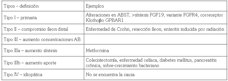 La clasificación clásica de la mala-absorción de AB se divide en tipo I (secundaria a disfunción del íleon), tipo II (idiopática o primaria con íleon normal) y tipo III (miscelánea o trastornos no relacionados con el íleon que alteran la absorción o la motilidad intestinal) 11,23,24 En una revisión reciente añaden una posible cuarta categoría en la que describen el aumento de la síntesis de AB causado por la metformina 17 25% to 50% of patients with functional diarrhea or diarrhea-predominant irritable bowel syndrome (IBS-D. La mala-absorción de AB pos-colecistectomía, se clasifica dentro del tipo 3; que incluye además la pancreatitis crónica, enfermedad celíaca, sobre-crecimiento bacteriano del intestino delgado y enteritis pos-radioterapia 25.
