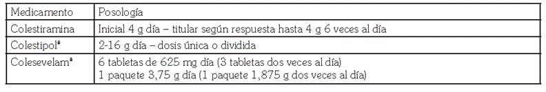 Los secuestradores de AB se unen a los AB cargados negativamente en el intestino delgado (18), previene su recirculación entero-hepática y aumenta su eliminación fecal hasta 3 veces el valor normal (41)possibly through signaling pathways involving farnesoid X receptor (FXR. La dosis de los secuestradores de AB que se presentan para el colesti-pol y colesevelam son las indicadas para el tratamiento de hiperlipidemia ya que no hay dosis descrita para mala-absorción de ácidos biliares. Ver tabla 2 para posología de secuestradores de AB.