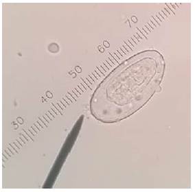 Se empleó la técnica de Graham tomando una sola muestra, y para la lectura se examinaron las muestras microscópicamente con observación por triple ciego, objetivos de 10x y 40x, utilizando el condensador con baja intensidad lumínica para conseguirun mejor contraste. El hallazgo de huevos característicos del agente etiológico en el frotis colectado fue indicador de positividad para Enterobius vermicularis (ver figura 1) 23. Los padres de familia o representantes del menor fueron informados de los resultados y en los casos positivos se les suministró tratamiento.