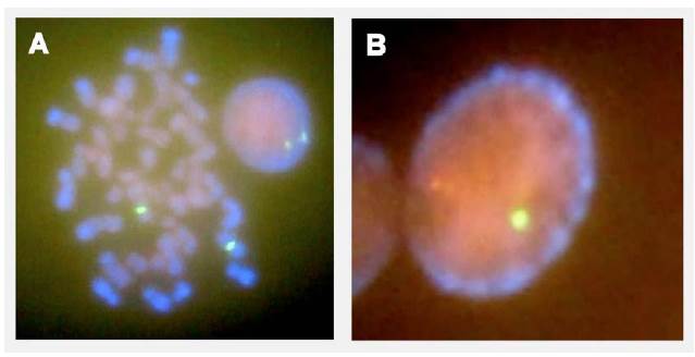 Se realizaron las observaciones con el microscopio de fluorescencia Nikon eclipse 80i, y para la captura de las señales fluorescentes se utilizó el programa de Lucia kario FISH. Se observaron dos fluorescencias verdes (Spectrum Green) de la sonda que contiene la secuencia del satélite alfa de la región DXZ1 que es específica para el cromosoma X (ver figura 1). No se observó fluorescencia naranja (Spectrum Orange) de la región cromosómica del gen SRY en 100 metafases y núcleos analizados. Su constitución cromosómica fue: 46,XX. ISH CEPX (DXZI, Xp11.1-q11.1x2), (SRY-)(Yp11.3-). Los resultados de los controles positivos fueron concordantes con el fenotipo y sexo de los donantes. En los resultados de la muestra del control positivo de individuo masculino, se observó una fluorescencia verde (Spectrum Green) de la sonda que contiene la secuencia del satélite alfa de la región DXZ1 y se observó una fluorescencia naranja (Spectrum Orange) de la región cromosómica del gen SRY (figura 1). En los resultados de la muestra del control negativo de individuo femenino, se pudieron ver las dos fluorescencias verdes (Spectrum Green) de la sonda que contiene la secuencia del satélite alfa de la región DXZ1 del cromosoma X.