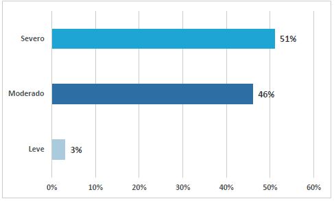 En la distribución del IMC los pacientes presentaron sobrepeso en un 51 %, seguido de 22 % que evidencia obesidad grado I (tabla 2). La intensidad media del dolor lumbar de acuerdo con la EVA fue de 7 (DS 1,89), y la mayor frecuencia de grado de dolor fue 8 (28 %), que corresponde a dolor severo (figura 1).