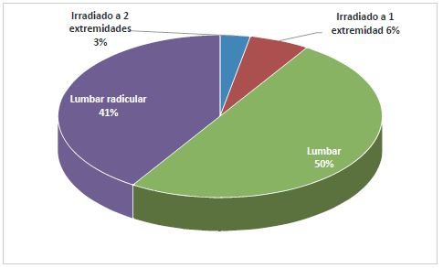 En cuanto a la distribución del patrón del dolor, el dolor lumbar aislado fue el más frecuente puesto que se presentó en el 50% de los pacientes, seguido del dolor lumbar radicular, en el 41 % de los casos (figura 2).