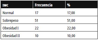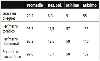 Frente al porcentaje de grasa corporal general de los pacientes, este se encontró elevado en un 71% de los casos: 33% en hombres y 38% en mujeres. La media del porcentaje de grasa en pliegues corporales fue de 20,2 y el porcentaje de grasa más frecuente 20 en 10 pacientes (10%). El perímetro corporal abdominal se observó elevado en un 68 %, característica que se presenta más alta en las mujeres, con 44 %, y en los hombres con 24 %. Finalmente, para el perímetro troncantérico, la media de los pacientes fue de 99,6 cm (tabla 3).