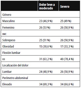Al realizar un análisis bivariado general se observó que existía una distribución homogénea de dolor de leve a severo entre géneros; el dolor es mayor en pacientes con IMC en sobrepeso con una tendencia a la obesidad, y se evidencia una disminución de los rangos de flexión lumbar en pacientes con dolor severo. La localización de dolor es mayor en región lumbar y el perímetro abdominal tiene una distribución similar entre rangos de dolor de leve a severo (tabla 4).