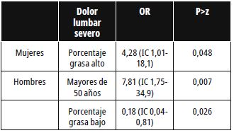 Al aplicar el coeficiente de correlación de Pearson para el análisis bivariado general y por género no se encontraron relaciones estadísticamente significativas. En la tabla 5, se presentan los resultados del análisis multivariado con los Odds Ratio, donde se puede observar que ser hombre mayor de 50 años implica ocho veces más riesgo de lumbalgia severa. En ese mismo grupo, aquellos con un porcentaje de grasa bajo tienen menor riesgo de dolor lumbar severo. Las mujeres con porcentaje de grasa elevado presentan un riesgo cuatro veces mayor de padecer lumbalgia severa.