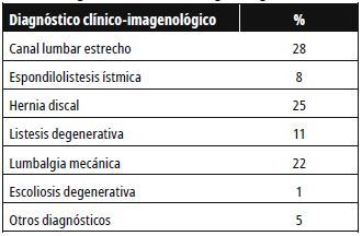 En cuanto a los diagnósticos desde el punto de vista clínico-imagenológico, predominarón el canal lumbar estrecho con un 28% de casos, hernia discal con un 25% y en 22% no se detectaron patologías específicas por lo que fueron clasificados como "lumbalgia mecánica" (tabla 6).