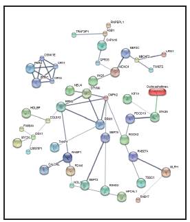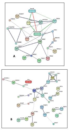 Finalmente, la red de interacción que relacionaba los genes afectados tanto por duplicación como por deleción (Figura 2), mostró una interacción asociada entre los dos tipos de mutaciones e implican ambos tipos de genes en una sola ruta de afecciones. Se observaron alteraciones en procesos biológicos tales como rutas de desoxirribonucleótidos, regulación del ritmo circadiano y regulación del transporte de L-glutamato. En cuanto a las funciones moleculares, se observaron alteraciones en la actividad fotoliasa del ADN, actividad quinasa timidilato, actividad en los receptores calcitoninos. Las rutas que se vieron más afectadas por las interacciones génicas fueron aquellas relacionadas con el ritmo circadiano.
