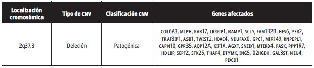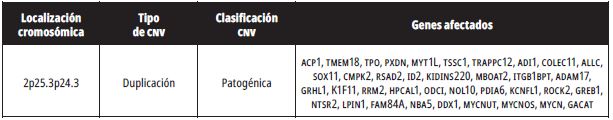 El estudio molecular de deleciones y duplicaciones por la técnica de hibridación genómica comparativa (HGC) determinó una duplicación patogénica en la región cromosómica 2p25.3p24.3, con coordenadas genómicas Chr2:17019_16364856 de 16,34 Mb, relacionada con la afección de 36 genes (Tabla 1). Adicionalmente se identificó una deleción patogénica en la citobanda 2q37.3, coordenadas genómicas Chr2: 238043371_243040276 de 4,99 Mb; deleción relacionada con la afección de 36 genes (Tabla 2).