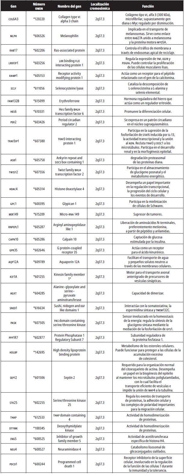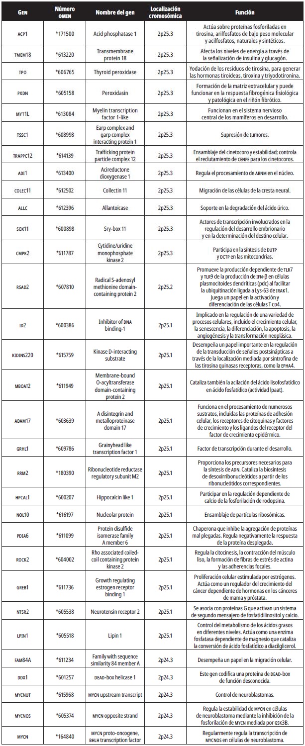 La identificación de las funciones descritas de los genes involucrados en la duplicación 2p25.3p24.3 (Tabla 3) y la deleción en 2q37.3 (Tabla 4) mostró la afección de genes implicados en la regulación de procesos celulares, como el crecimiento celular, la senescencia, la diferenciación, la apoptosis, la angiogénesis y la transformación neoplásica, así como múltiples procesos asociados a factores de crecimiento y afecciones en los patrones circadianos, que resultan afectados por estas duplicaciones-deleciones.