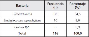 Se aislaron: E. coli, Proteus spp. y S. saprophyticus, el patógeno más frecuentemente aislado fue E. coli en el 84,5% de las muestras (tabla 1).