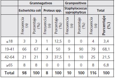 En todos los grupos etários, la bacteria predominante fue E. coli con el 84%. S. saprophyticus se encontró en un 90% en mujeres de 19 a 41 años (tabla 3).