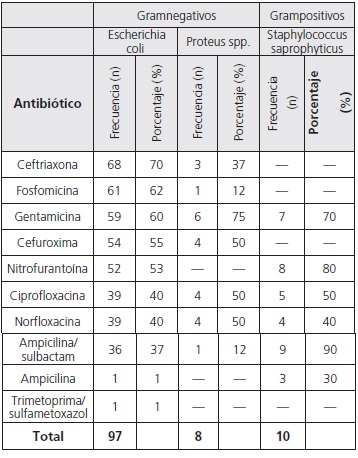 Results: In the 116 samples, Escherichia coli (84.5%), Staphylococcus saprophyticus (8.6%) and Proteus spp. (6.9%) were isolated. E. coli showed sensitivity to ceftriaxone in 70%, followed by fosfomycin and gentamicin with 62 and 60%, respectively. The sensitivity found for quinolones was 40% and for sulbactam ampicillin reached a 37%. Proteus spp. showed sensitivity of 75% for gentamicin and 50% for quinolones and cefuroxime. S. saprophyticus had a sensitivity greater than 50% for gentamicin, sulbactam ampicillin, quinolones and nitrofurantoin. For E. coli the highest resistance recorded was found on ampicillin in 86.5%, followed by quinolones with a resistance greater than 50%. Ampicillin associated with inhibitor of beta-lactamase, fosfomycin, cephalosporins, nitrofurantoin and aminoglycosides showed a resistance below 25%.