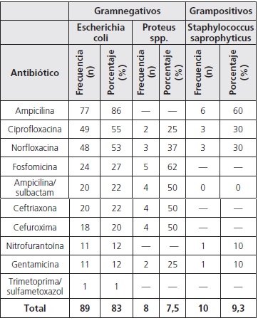 Conclusion: The most prevalent pathogen in urinary tract infections (UTI) is E. coli (84.7%), a percentage that matches what has been reported in national and world literature. The antimicrobials for this uropathogen with the highest resistance were ampicillin (86%), ciprofloxacin (55%) and norfloxacin (53%). This should be taken into account when administering an empiric therapy, even though this data should be corroborated with the susceptibility information depending on the context.