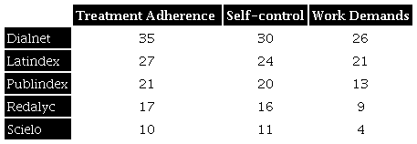 The data universe was indexed repositories such as Copernicus, Dialnet, Latindex, Publindex, Redalyc, and Scielo. The sample consisted of the literature selected intentionally with the keywords "treatment adherence," "self-control," and "work demands," and published between 2005-2019 (see Table 1).