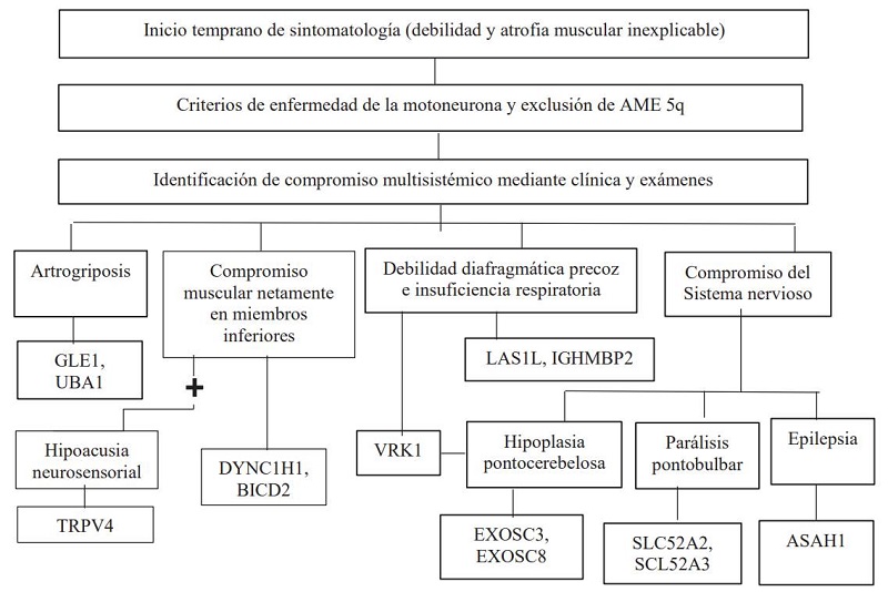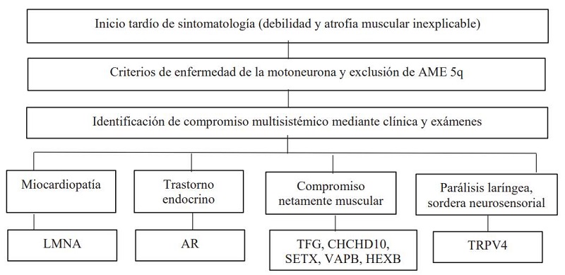La AME es considerada un reto médico. La sospecha diagnóstica se inicia ante un paciente con clínica consistente en: debilidad muscular o hipotonía, no atribuida a causas secundarias; signos clínicos que sugieren compromiso de la neurona motora inferior (atrofia muscular, fasciculaciones, hipotonía, pie equino, contracturas deformantes, escápula alada, hipoarreflexia o arreflexia). También se deben tener en cuenta la edad de inicio de las manifestaciones clínicas tipo temprano (congénito, infancia precoz, niñez temprana) o tardío (adulto joven, adulto mayor); la progresión de la sintomatología: rápida o lenta; la afectación de otros sistemas u órganos y el conocimiento de las distintas entidades descritas en las tablas 1 y 2, todo lo cual permitirá una correcta toma de decisiones 2,3.