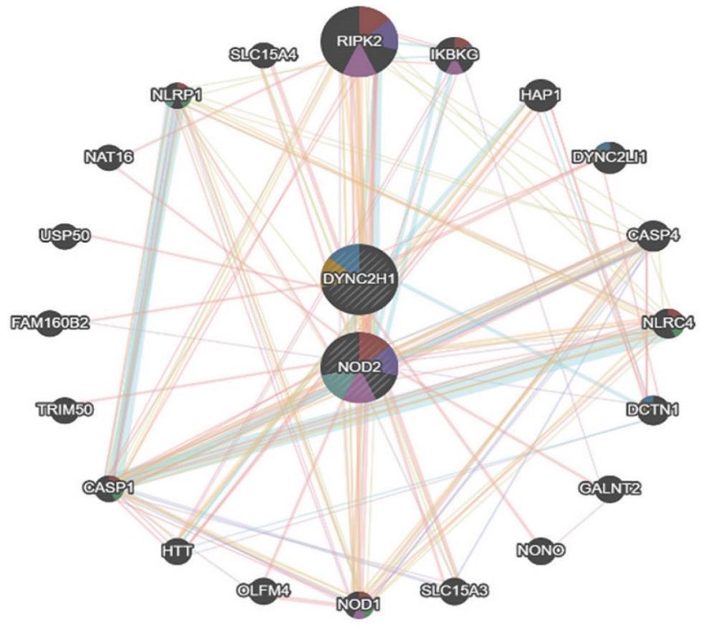 El gen DYNC2H1 presentó interacción física con seis genes diferentes, teniendo con uno de ellos (DYNC2LI1) una alta interacción. El gen NOD2 por su parte fue el que más interacciones físicas reportó 16. La asociación con el gen RIPK2 fue la más fuerte de ellas.