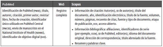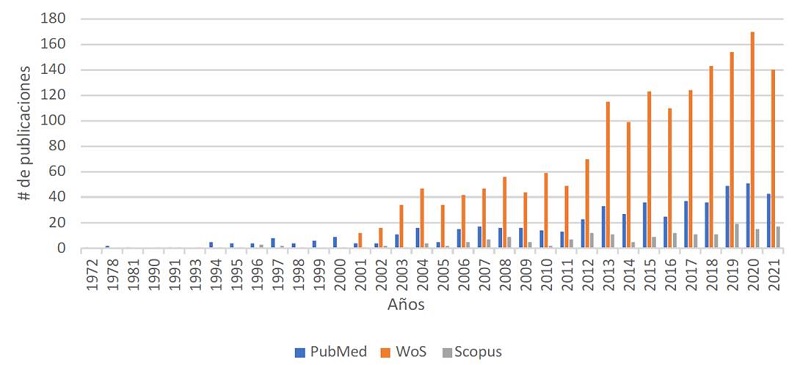 Otra de las limitaciones fue el inicio de la disponibilidad de la información en cada base de datos como resultado de las políticas de convenio adquiridas; adicionalmente, en PubMed no hay indicadores bibliométricos ni se puede descargar información relacionada con los países de publicación, por lo que no se pudo incluir esta base de datos en algunos de los resultados presentados.